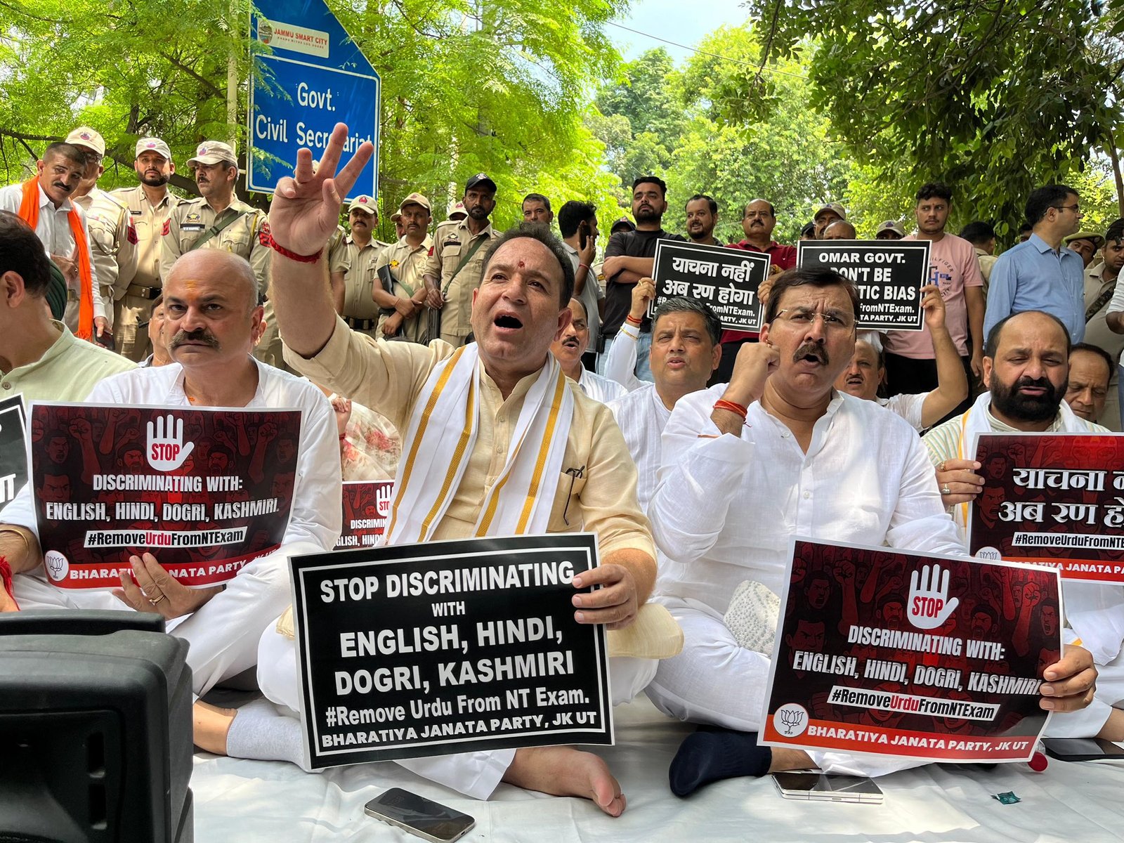 “We are staging this dharna because making Urdu mandatory for Naib Tehsildar exams is completely unacceptable,” said BJP MLA and former minister Sham Lal Sharma. “This is yet another instance of discrimination by Kashmir-centric parties, particularly the National Conference, which have sidelined Jammu for decades.”