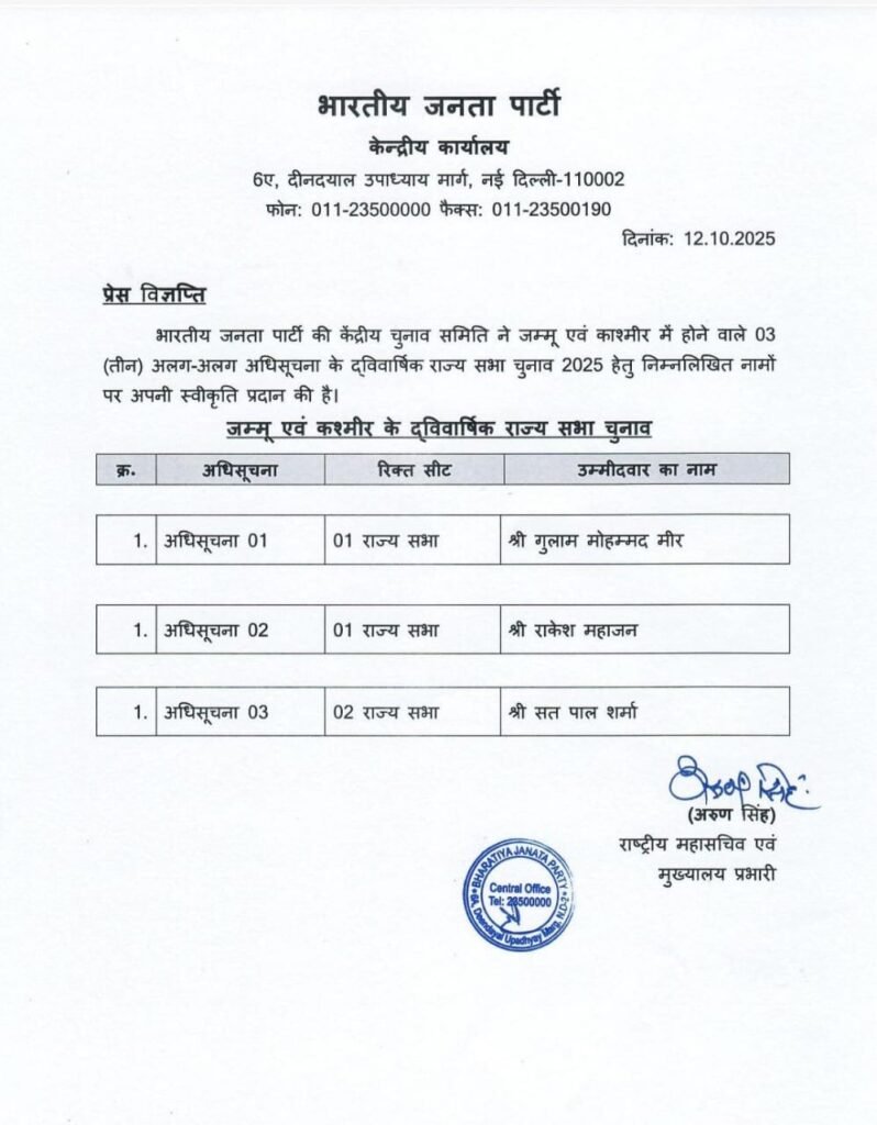 HomeJammuBJP releases a list of candidates for the Biennial Elections to the... JammuJammu and KashmirKashmirNationalPoliticsTop News BJP releases a list of candidates for the Biennial Elections to the Rajya Sabha from Jammu and Kashmir. October 12, 2025 Share FacebookTwitterWhatsAppEmailPrintTelegramCopy URL BJP releases a list of candidates for the Biennial Elections to the Rajya Sabha from Jammu and Kashmir. TagsBJPBJPJammuKashmirRajyaSabha Share FacebookTwitterWhatsAppEmailPrintTelegramCopy URL Previous article15 Pakistani Soldiers Killed in Taliban Retaliatory Operations in Helmand ProvinceNext article58 Pakistani Soldiers Killed in Afghan Retaliatory Strikes; Tensions Escalate Along Durand Line RELATED ARTICLES Business Agencies Flag ‘Crypto Hawala’ Network Funding Terror Activities in J&K January 18, 2026 Education Over 72% Children Under Five in J&K Anaemic, Doctors Flag Silent Nutrition Crisis January 11, 2026 Defence Fresh Snow and Tight Security Turn Bhaderwah into Winter Hotspot January 11, 2026 - Advertisment - Most Popular Agencies Flag ‘Crypto Hawala’ Network Funding Terror Activities in J&K January 18, 2026 Over 72% Children Under Five in J&K Anaemic, Doctors Flag Silent Nutrition Crisis January 11, 2026 Fresh Snow and Tight Security Turn Bhaderwah into Winter Hotspot January 11, 2026 Somnath Reminds Us Sanatan Dharma Is Eternal, Not Erasable: Gaurav Gupta January 11, 2026 Load more Recent Comments