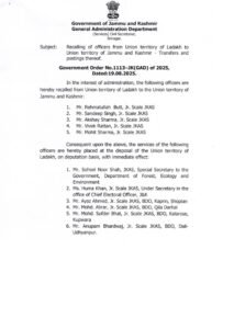 JAMMU, Aug 19: The Jammu and Kashmir Government on Tuesday ordered the transfer of officers between the Union Territories of J&K and Ladakh.