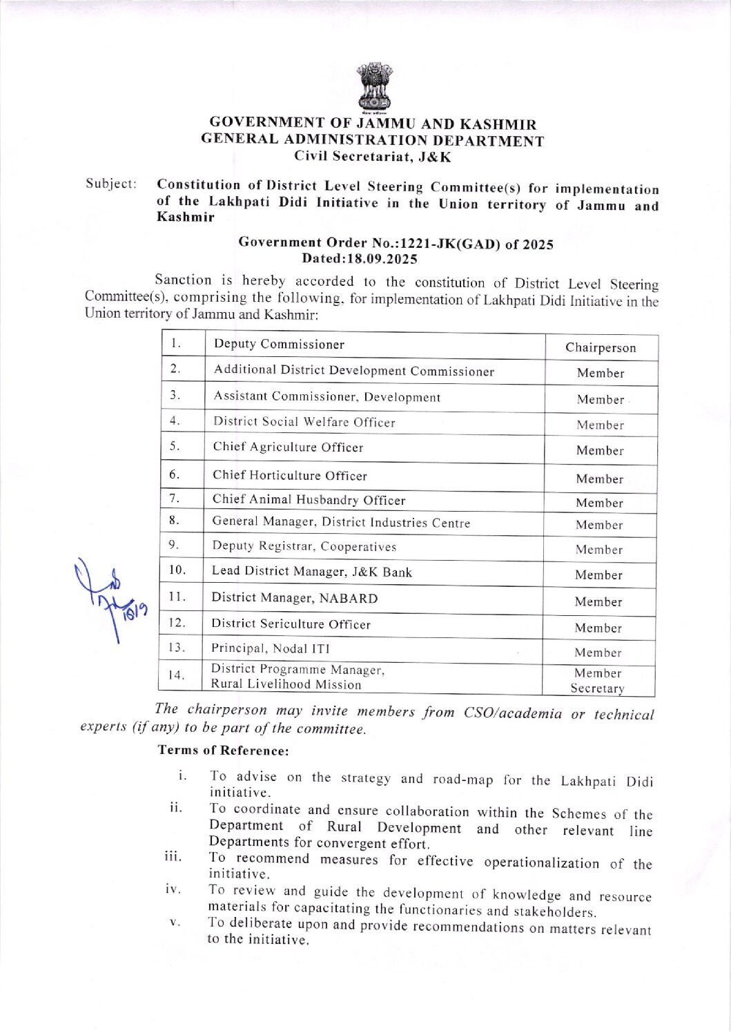 JAMMU, Sep 18: The Jammu and Kashmir Government has ordered the formation of District Level Steering Committees across the Union Territory to oversee the implementation of the Lakhpati Didi Initiative.