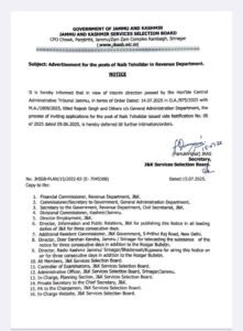 Jammu, July 15: The Jammu and Kashmir Services Selection Board (JKSSB) has deferred the recruitment process for Naib Tehsildar posts in the Revenue Department until further orders.
